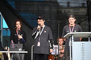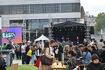 Ab 14 Uhr begann dann die „Come-together-Party“ mit dem DJ auf der Hauptbühne. Der Name war Programm: Immer mehr Erstis strömten bepackt mit ihren Ersti-Tüten auf den Campus. Viele versammelten sich auf dem Rasen, um Flunkyball zu spielen. Andere holten sich an dem Kaffee-Container gegen eine kleine Spende einen Kaffee oder sind weiter mit anderen ins Gespräch gekommen. Einige Erstis benannten den schönen Campus und das Kennenlernen ihrer Kommiliton:innen als Highlight des Tages.