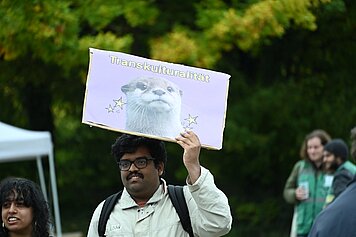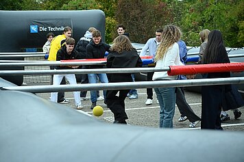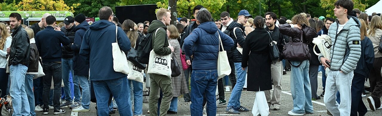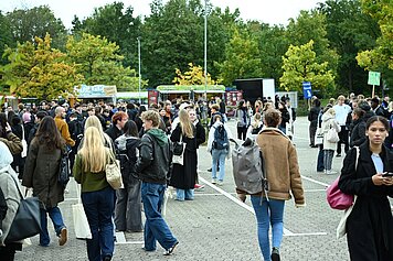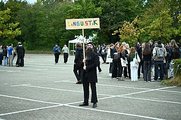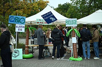 Nachdem über alles Wichtige informiert wurde, machten sich die Erstis um 14:30 Uhr auf den Weg zum Parkplatz P2. Mit ihren Ersti-Tüten im Schlepptau suchten sie ihre Fachschaften und fanden sich unter den bunten-selbstgebastelten Schildern zusammen. Viele begannen mit ihren neuen Bekanntschaften die einzelnen Stände auf P2 zu erkunden.