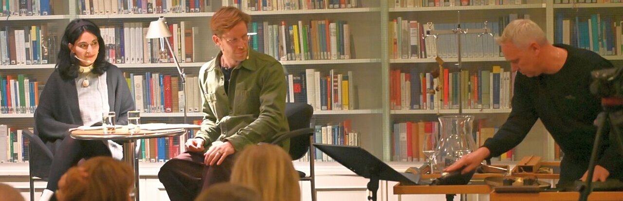Es wird still im Saal und alle schauen gespannt auf die Bühne, wo Jasmin-Nevin Varul und Nikolaus Benda Platz genommen haben. Allerdings bleibt es nicht lange ruhig im Lesesaal des Heine-Instituts, denn Ralf Zartmann beginnt, mit verschiedensten Gegenständen eine Geräuschkulisse zu erschaffen. Und schon ist das Publikum mittendrin in Heines Wintermärchen.