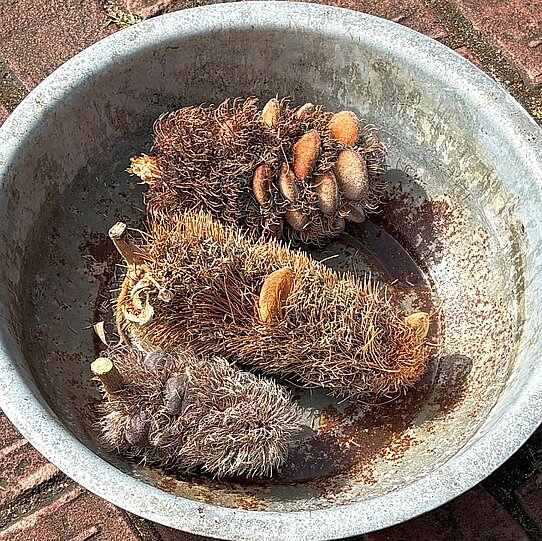Ohne Feuer bleiben die Früchte der Pyrophyten verschlossen (Bild links). Nach dem Experiment mit dem Gasbrenner öffnen sich die Früchte und geben den Samen frei (Bild rechts).